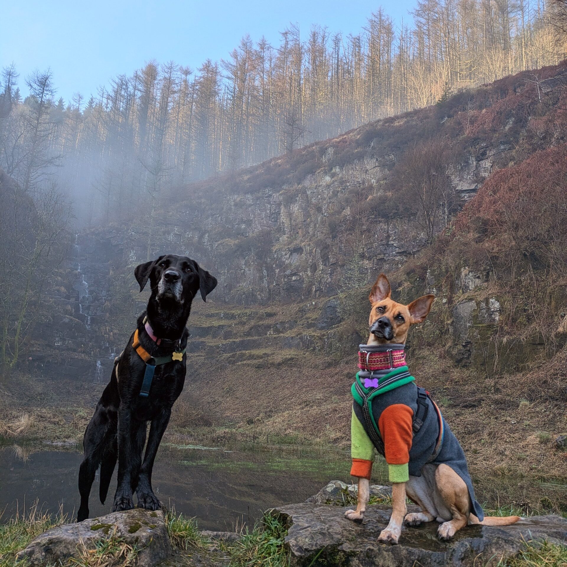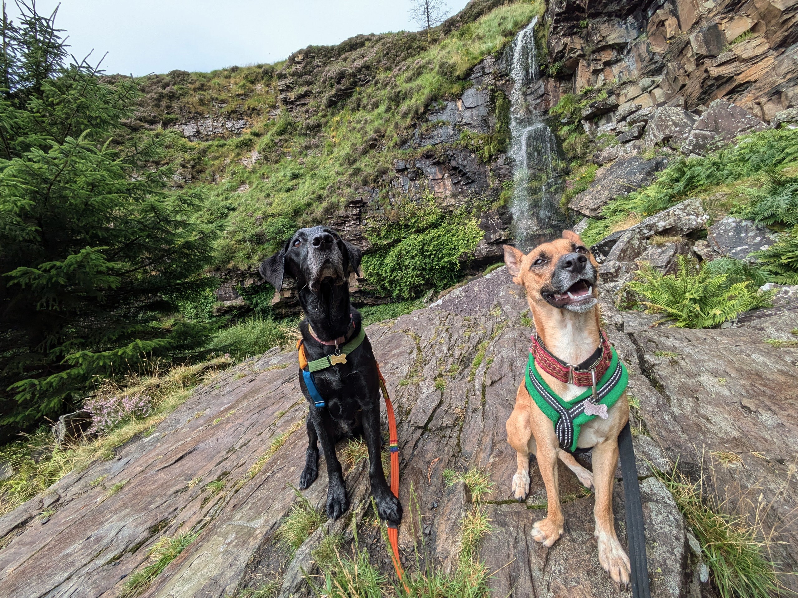 This walk has a car park, a lake with ducks, but the best bit for dogs is further along towards the Cambrian Colliery Memorial and past that to a beautiful waterfall and pond.